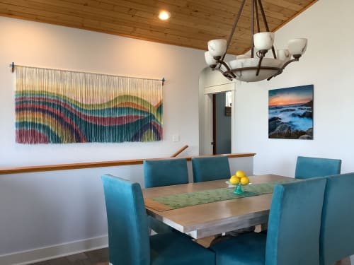 A quality wool blend of 40% Australian Merino, 20% Alpaca, and 40% Premium Acrylic. Each strand hangs from a Tasmanian Oak rod, and is hand-dyed using Australian colourfast dyes. This artwork comes fully assembled on the timber rod, and ready to hang as per photos.