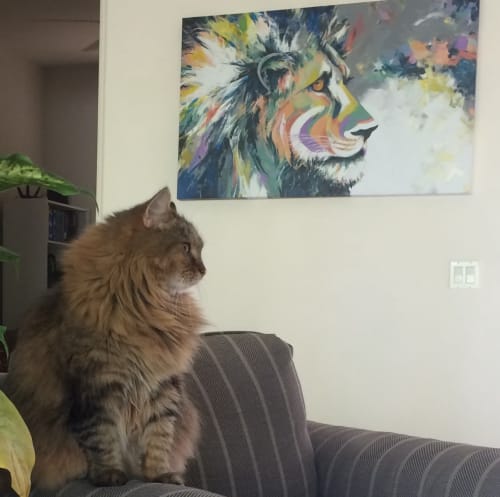 This 30 x 40 x 2" acrylic painting on canvas is beautifully placed in the exquisitly designed and furnished home of major art collectors. Under the Art in US Embassies program, it was previously displayed for 3 years in the Ambassador's residence in Freetown, Sierra Leone