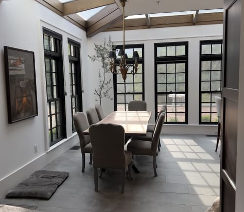 We created a magnolia beam console with rough sawn characteristics and rich custom color.